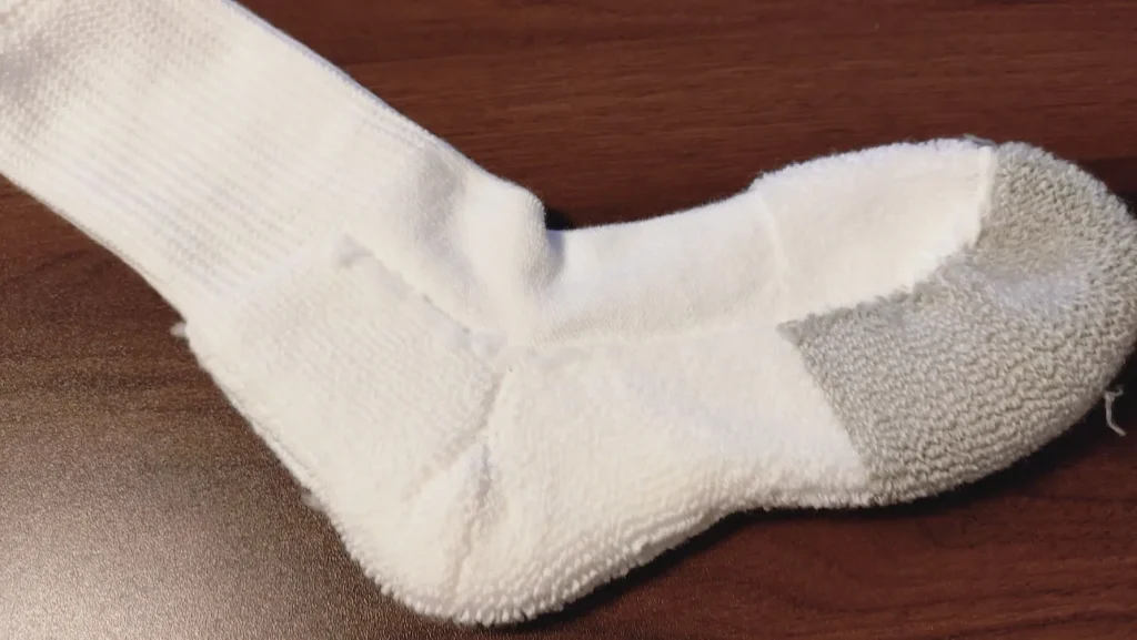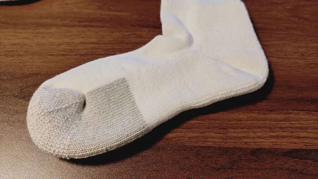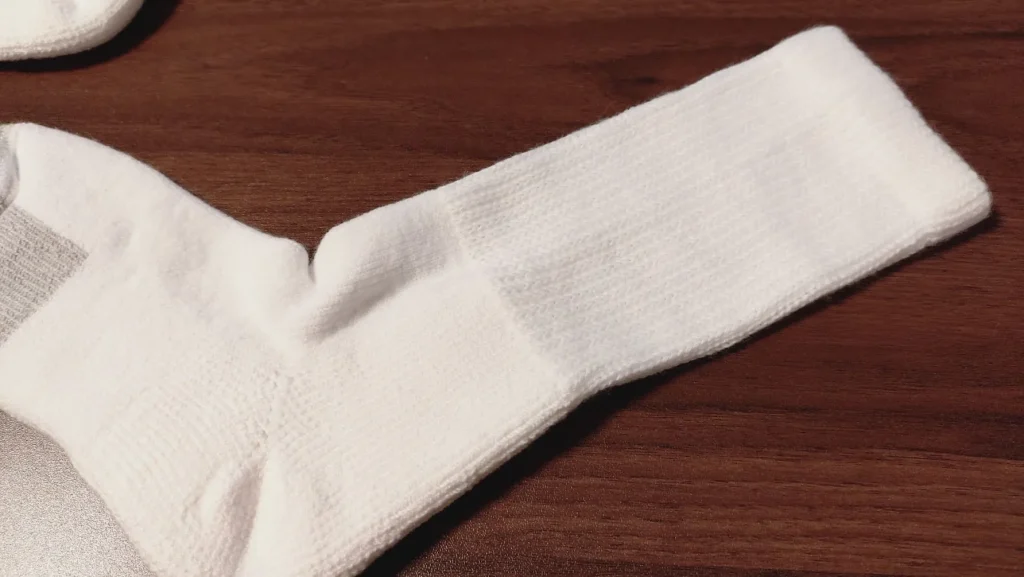 足を入れたときのふかふかとした感触がとても心地よくて、思わず「これこれ」と頷いてしまうほど。厚手のソックスは好みが分かれるところですが、特にハードコートやカーペットコートでのプレーでは、衝撃をしっかりと和らげてくれる感覚があります。