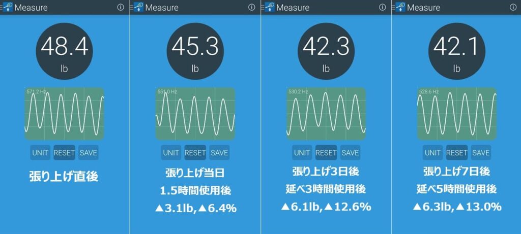 上述の通りポリエステルとしてはテンション低下が緩やかなストリングです。